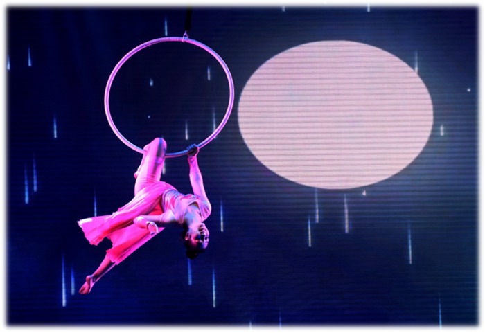演員在舞臺(tái)上蹬著音樂的臺(tái)階迅速將身體拉升到空中,在聚光燈的映射下,光影交錯(cuò)間好似月宮仙子飛升奔月。待到月上高空,臺(tái)下云霧繚繞,演員抱著明月似的圓環(huán)旋轉(zhuǎn)翻騰,雙足憑空踩踏,就像蜻蜓點(diǎn)水般在腳下無數(shù)云彩上妙舞。
